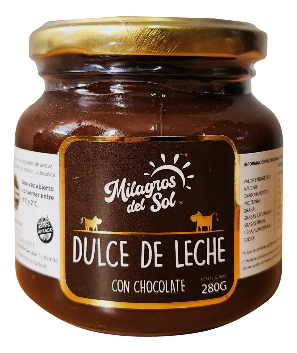 Dulce de Leche con Chocolate de Milagros del Sol es una delicadeza que combina la suavidad del dulce de leche tradicional con el rico sabor del chocolate. Este producto promete satisfacer a los amantes de los postres con su textura cremosa y su sabor intenso, ideal para añadir a tus tostadas, helados o simplemente disfrutar con una cuchara.